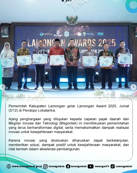 "Pemerintah Kabupaten Lamongan terus berinovasi untuk memberikan pelayanan yang maksimal dan berdampak untuk masyarakat," tutur Bupati Lamongan Yuhronur Efendi saat hadir pada Lamongan Award 2025.