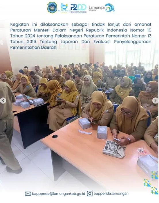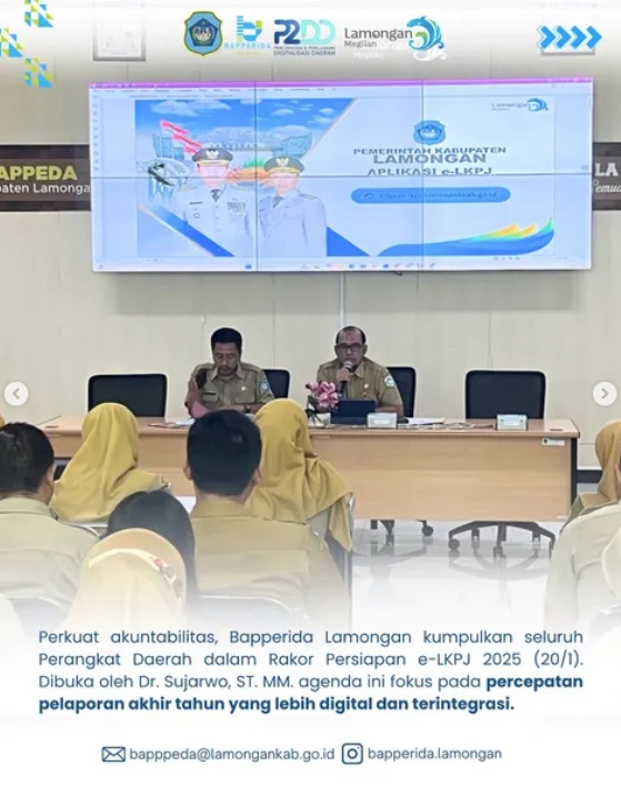 Dalam rangka penyusunan Laporan Keterangan Pertanggungjawaban Kepala Daerah Akhir Tahun Anggaran 2025, Bapperida Kabupaten Lamongan melaksanakan Rapat Koordinasi Persiapan Penyusunan LKPJ Kepala Daerah Akhir Tahun Anggaran 2025 melalui e-LKPJ di Ruang Rapat LA Planning Bapperida Lt. 2 pada hari Selasa, 20 Januari 2026. Rapat Koordinasi dibuka secara langsung oleh Kepala Bapperida Kabupaten Lamongan Dr. Sujarwo, ST, MM. dan diikuti oleh seluruh Perangkat Daerah di Kabupaten Lamongan.
