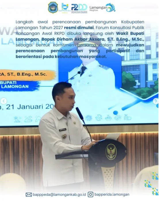 Langkah awal perencanaan pembangunan Kabupaten Lamongan Tahun 2027 resmi dimulai. Forum Konsultasi Publik Rancangan Awal RKPD dibuka langsung oleh Wakil Bupati Lamongan, Bapak Dirham Akbar Aksara, S.T. B.Eng., M.Sc., sebagai bentuk komitmen bersama dalam mewujudkan perencanaan pembangunan yang partisipatif dan berorientasi pada kebutuhan masyarakat.