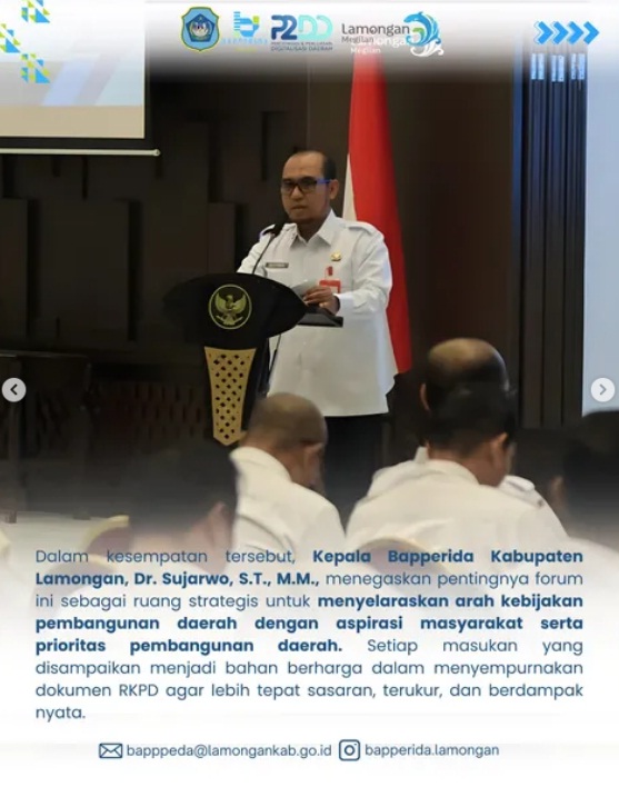 Dalam kesempatan tersebut, Kepala Bapperida Kabupaten Lamongan, Dr. Sujarwo, S.T., M.M., menegaskan pentingnya forum ini sebagai ruang strategis untuk menyelaraskan arah kebijakan pembangunan daerah dengan aspirasi masyarakat serta prioritas pembangunan daerah. Setiap masukan yang disampaikan menjadi bahan berharga dalam menyempurnakan dokumen RKPD agar lebih tepat sasaran, terukur, dan berdampak nyata.