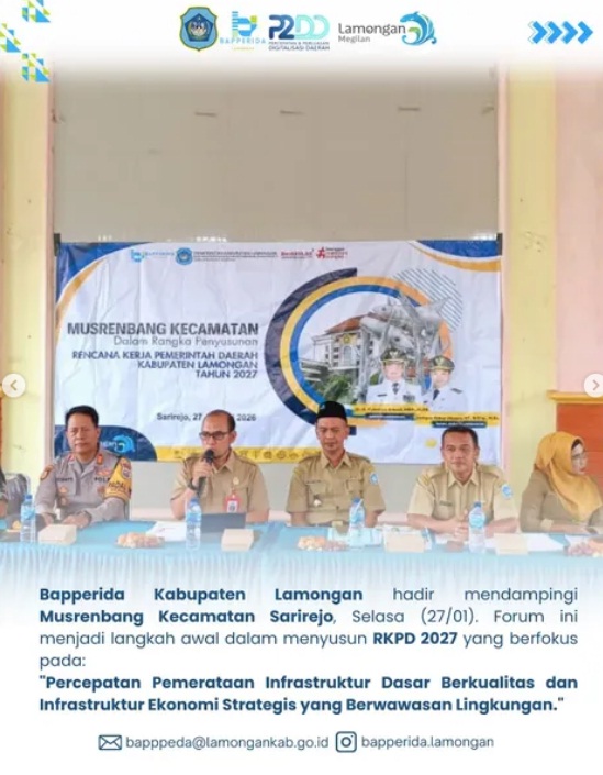 Bapperida Kabupaten lamongan hadir mendamping Musrenbang Kecamatan Sarirejo, Selasa (27/01). Forum ini menjadi langkah awal dalam menyusun RKPD 2027 yang berfokus pada: "Percepatan Pemerataan Infrastruktur Dasar Berkualitas dan Infrastruktur Ekonomi Strategis yang Berwawasan Lingkungan.