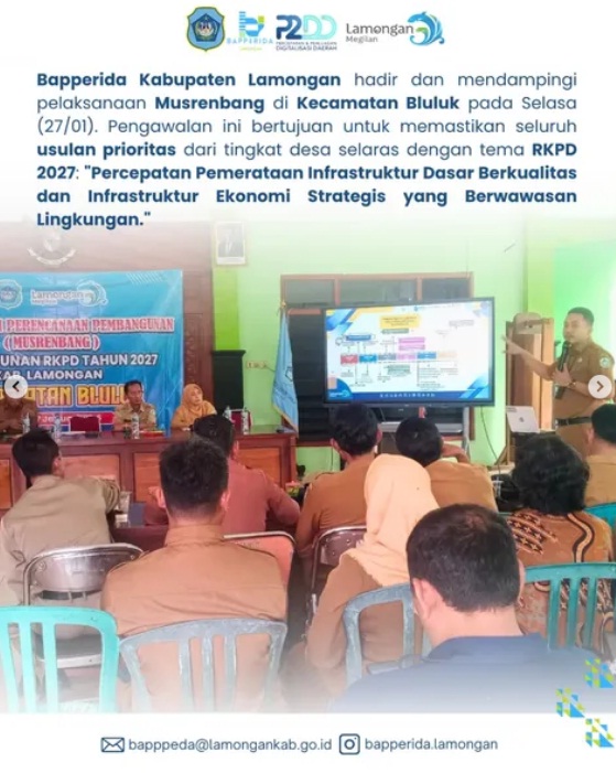 Bapperida Kabupaten Lamongan hadir dan mendamping pelaksanaan Musrenbang di Kecamatan Bluluk pada Selasa (27/01). Pengawalan ini bertujuan untuk memastikan seluruh usulan prioritas dari tingkat desa selaras dengan tema RKPD 2027: "Percepatan Pemerataan Infrastruktur Dasar Berkualitas dan Infrastruktur Ekonomi Strategis yang Berwawasan Lingkungan."