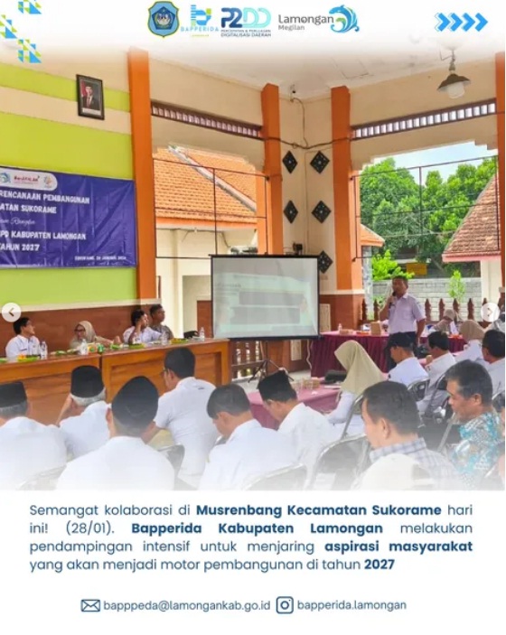 Semangat kolaborasi di Musrenbang Kecamatan Sukorame hari ini! (28/01). Bapperida Kabupaten Lamongan melakukan pendampingan intensif untuk menjaring aspirasi masyarakat yang akan menjadi motor pembangunan di tahun 2027.