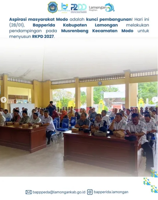 Aspirasi masyarakat Modo adalah kunci pembangunan! Hari ini (28/01), Bapperida Kabupaten Lamongan melakukan pendampingan pada Musrenbang Kecamatan Modo untuk menyusun RKPD 2027.