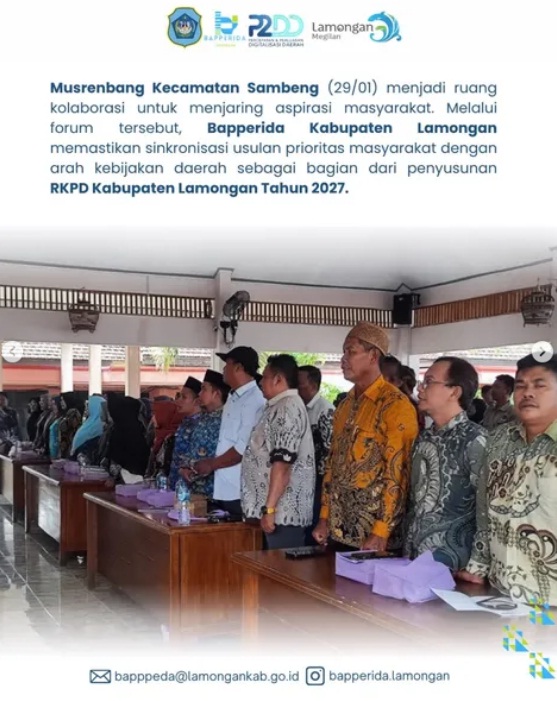 Telah dilaksanakan Musyawarah Perencanaan Pembangunan (Musrenbang) di Kantor Kecamatan Sambeng pada hari Kamis, 29 Januari 2026. Musrenbang kecamatan ini merupakan wadah partisipasi masyarakat dalam menyusun usulan kegiatan prioritas pembangunan pada RKPD Kabupaten Lamongan Tahun 2027.