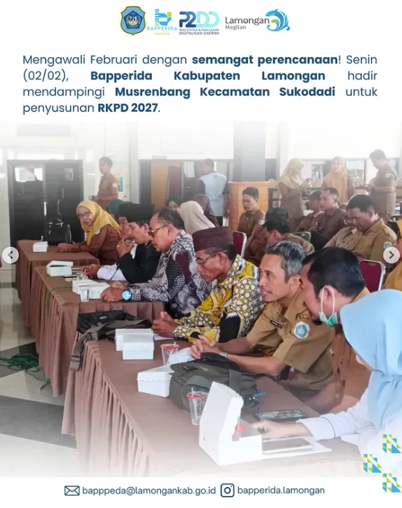 Mengawali Februari dengan semangat perencanaan! Senin (02/02), Bapperida Kabupaten Lamongan hadir mendampingi Musrenbang Kecamatan Sukodadi untuk penyusunan RKPD 2027.