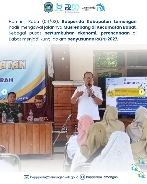 Hari ini, Rabu (04/02), Bapperida Kabupaten Lamongan hadir mengawal jalannya Musrenbang di Kecamatan Babat. Sebagai pusat pertumbuhan ekonomi, perencanaan di Babat menjadi kunci dalam penyusunan RKPD 2027.