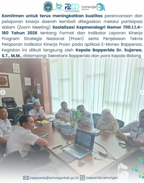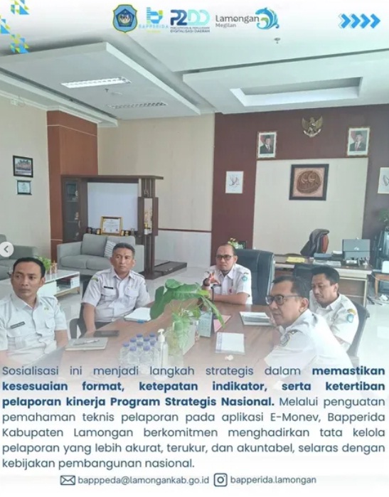 Melalui sosialisasi ini, diharapkan seluruh perangkat daerah semakin memahami standar pelaporan yang baru, sehingga pelaksanaan Program Strategis Nasional di Kabupaten Lamongan dapat berjalan optimal, transparan, dan selaras dengan arah pembangunan nasional