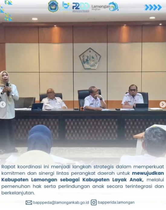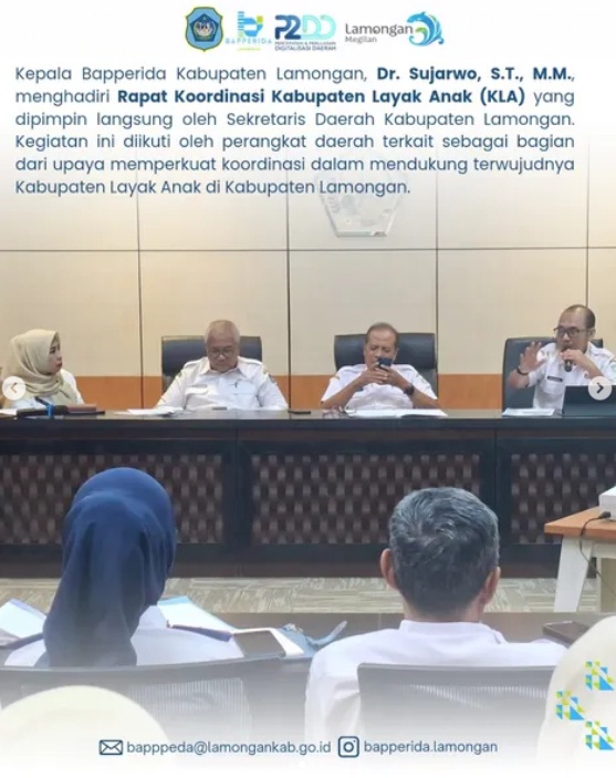 Kepala Bapperida Kabupaten Lamongan, Dr. Sujarwo, S.T., M.M., menghadiri Rapat Koordinasi Kabupaten Layak Anak (KLA) yang dipimpin langsung oleh Sekretaris Daerah Kabupaten Lamongan.Kegiatan ini diikuti oleh perangkat daerah terkait sebagai bagian dari upaya memperkuat koordinasi dalam mendukung terwujudnya Kabupaten Layak Anak di Kabupaten Lamongan.