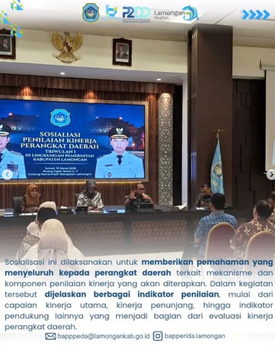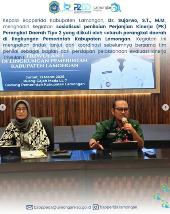 Kepala Bapperida Kabupaten Lamongan, Dr. Sujarwo, S.T., M.M., menghadiri kegiatan sosialisasi penilaian Perjanjian Kinerja (PK) Perangkat Daerah Tipe 2 yang diikuti oleh seluruh perangkat daerah di lingkungan Pemerintah Kabupaten Lamongan. Kegiatan ini merupakan tindak lanjut dari koordinasi sebelumnya bersama tim penilai sebagai bagian dari persiapan pelaksanaan evaluasi kinerja Triwulan I.