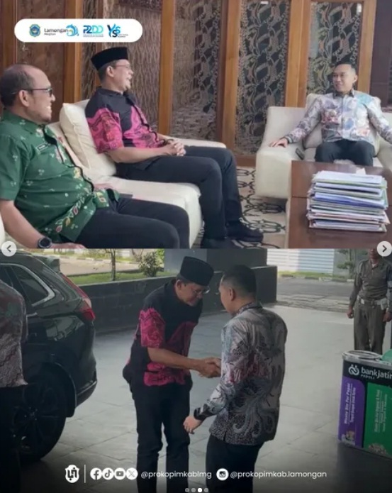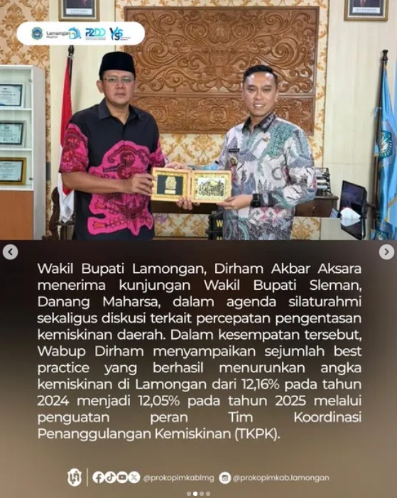 Wakil Bupati Lamongan, Dirham Akbar Aksara menerima kunjungan Wakil Bupati Sleman, Danang Maharsa, dalam agenda silaturahmi sekaligus diskusi terkait percepatan pengentasan kemiskinan daerah, Jumat (13/3). Dalam kesempatan tersebut, Wabup Dirham menyampaikan sejumlah best practice yang berhasil menurunkan angka kemiskinan di Lamongan dari 12,16% pada tahun 2024 menjadi 12,05% pada tahun 2025 melalui penguatan peran Tim Koordinasi Penanggulangan Kemiskinan (TKPK).