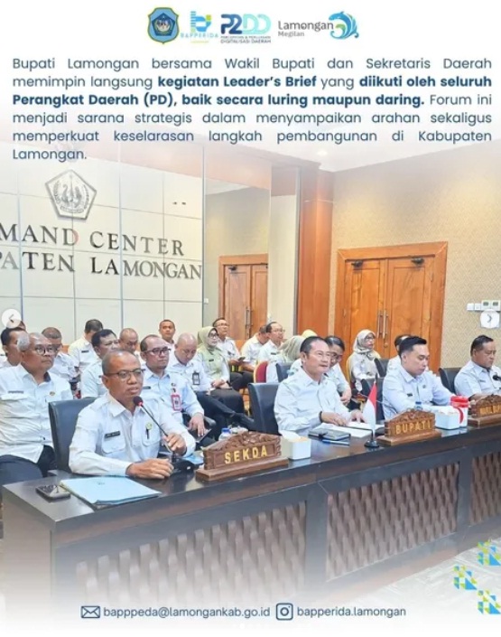 Bupati Lamongan bersama Wakil Bupati dan Sekretaris Daerah memimpin langsung kegiatan Leader’s Brief yang diikuti oleh seluruh Perangkat Daerah (PD), baik secara luring maupun daring. Forum ini menjadi sarana strategis dalam menyampaikan arahan sekaligus memperkuat keselarasan langkah pembangunan di Kabupaten Lamongan.