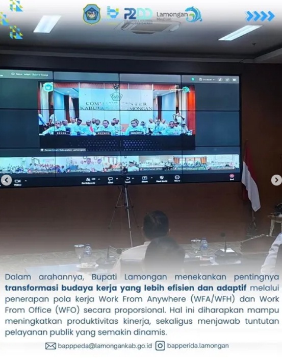 Dalam arahannya, Bupati Lamongan menekankan pentingnya transformasi budaya kerja yang lebih efisien dan adaptif melalui penerapan pola kerja Work From Anywhere (WFA/WFH) dan Work From Office (WFO) secara proporsional. Hal ini diharapkan mampu meningkatkan produktivitas kinerja, sekaligus menjawab tuntutan pelayanan publik yang semakin dinamis.